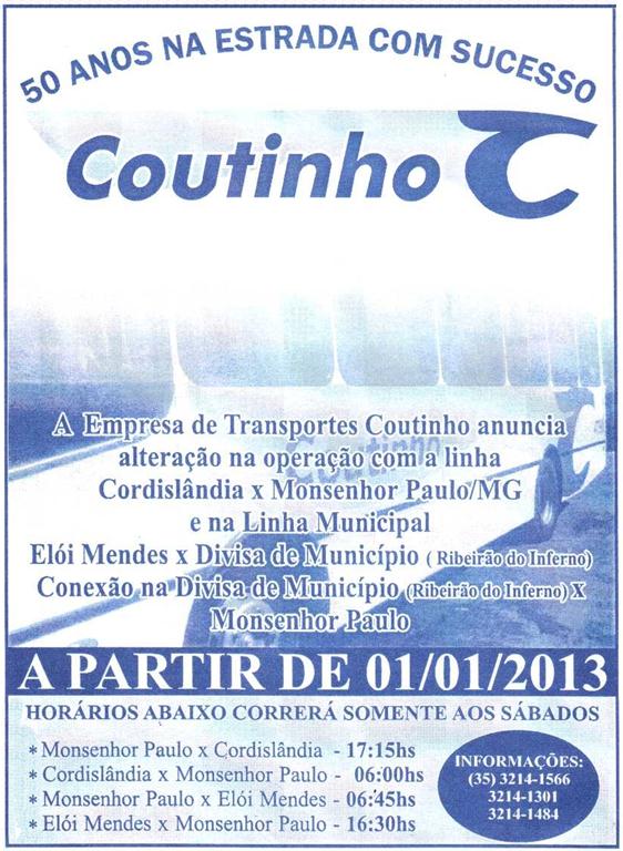 Devido ao pequeno número de usuários na linha de ônibus que liga Elói Mendes X Monsenhor Paulo com extensão até Cordislândia, a empresa Coutinho, considerando o prejuízo financeiro que a empresa estava enfrentando resolveu … Clique em Leia Mais e confira a notícia completa