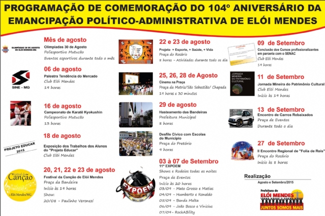 Festival da Canção, Evento Esportivo, Cinema na Praça, Desfile Cívico, EXPOEM, Jornada Mineira do Patrimônio…