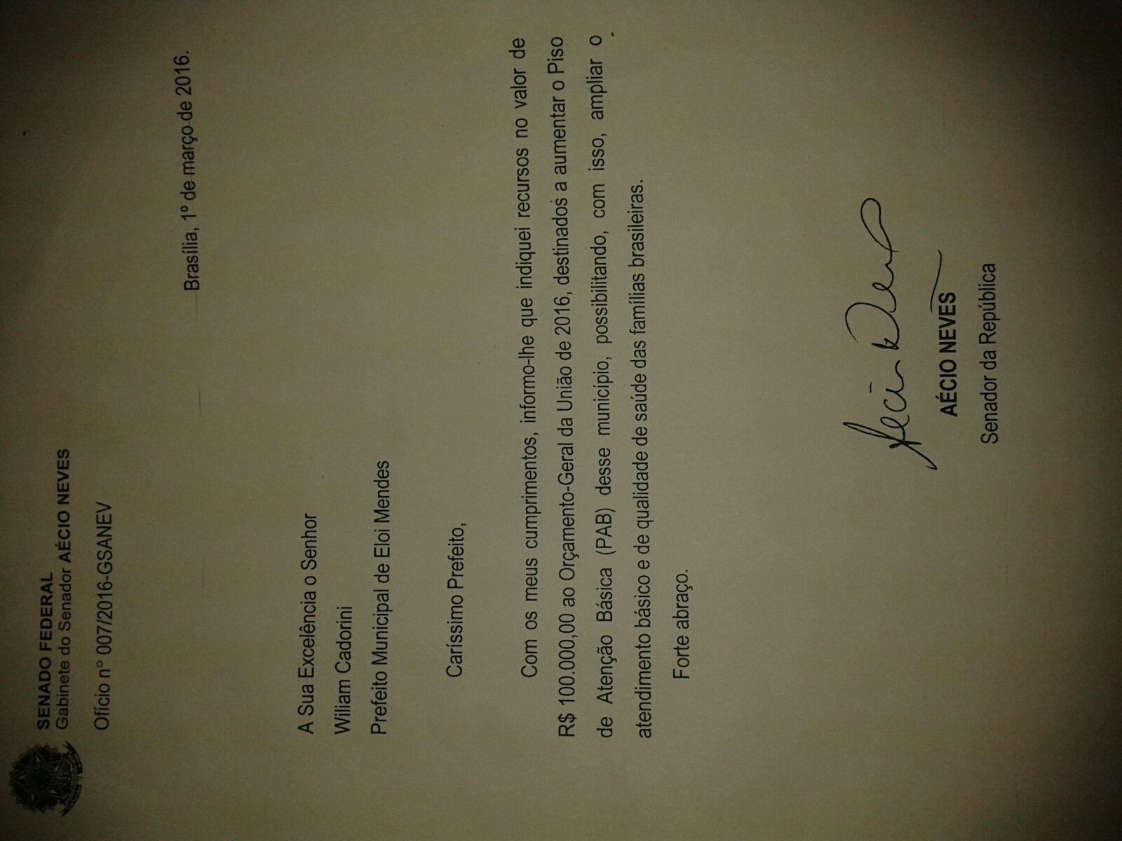 Pela primeira vez na história de Elói Mendes, um senador da república destina recursos para o município.