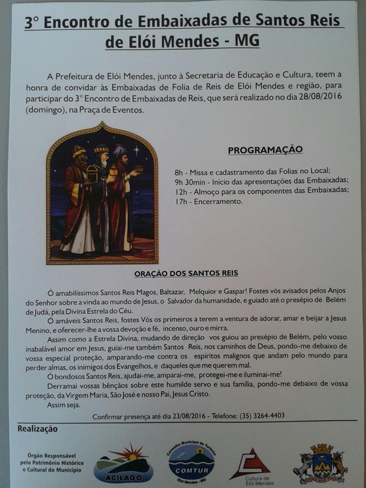 O 3º Encontro de Folia de Reis será realizado na Praça de Eventos de Elói Mendes a partir das 08:00 horas da manhã de domingo (28/08). Uma missa será celebrada e em seguida tem início às apresentações das embaixadas. Às 12:00 horas pausa para o almoço, e às 17:00 horas o encerramento.