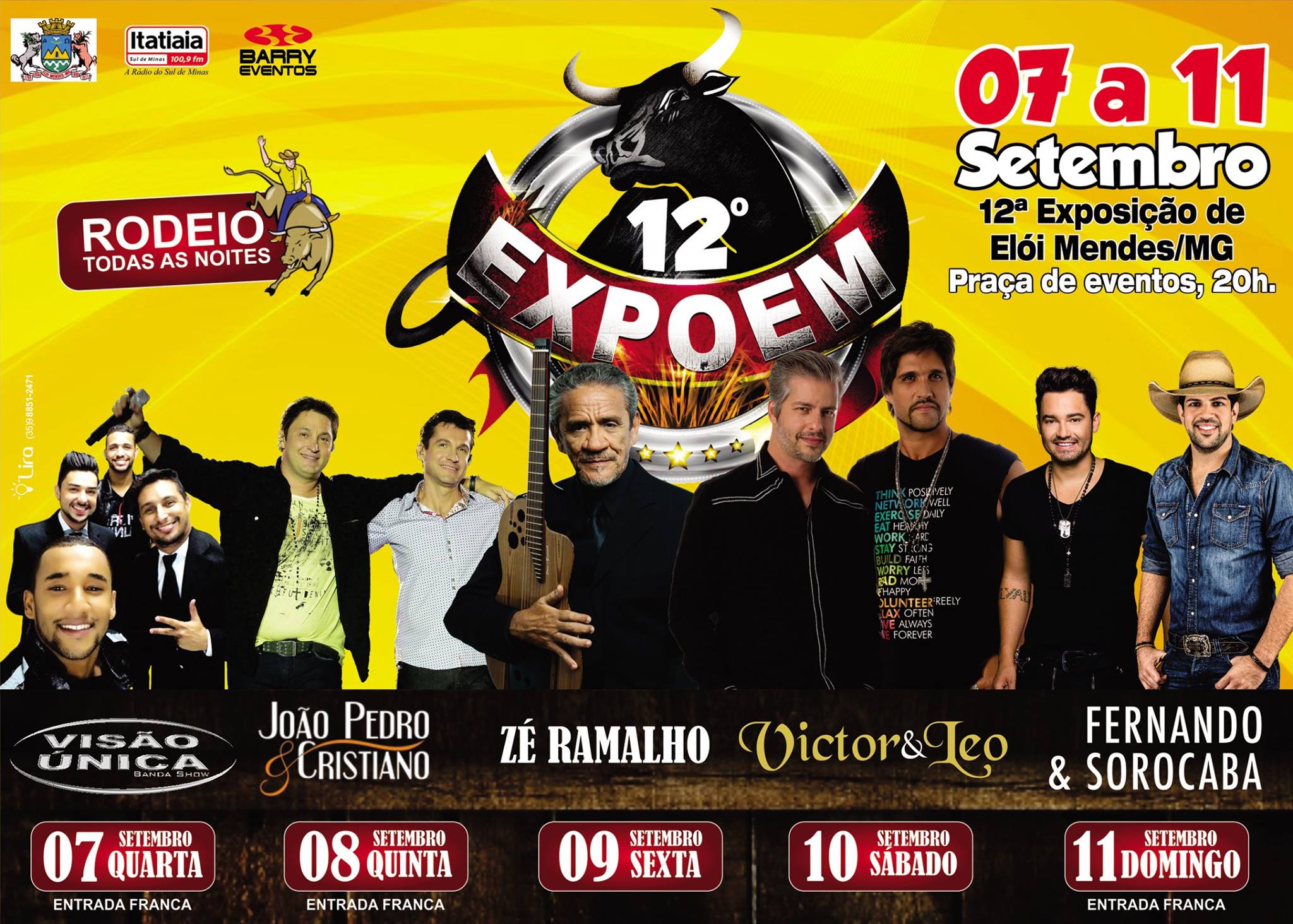 Utilidade Pública Elói Mendes News 16/08/2016 EXPOEM acontecerá de 07 a 11 de setembro Clique para compartilhar esta notícia A XII EXPOEM acontecerá entre os dias 07 à 11 de Setembro de 2016 na Praça de Eventos. Clique em Leia Mais e confira programação completa da festa. . .