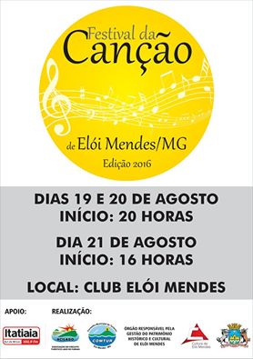 O Festival da Canção de Elói Mendes iniciará suas apresentações na próxima sexta-feira a partir das 20 horas no Club Elói Mendes. Haverá ainda a Feira de Cerveja Artesanal e Produtos Artesanais de Elói Mendes e Região. As apresentações acontecerão de sexta a domingo, sendo o ultimo dia a final do festival que iniciará a partir das 16 horas. A Rua Adelaide Machado Ximenes será interditada nas proximidades do Club Elói Mendes para realização do evento.