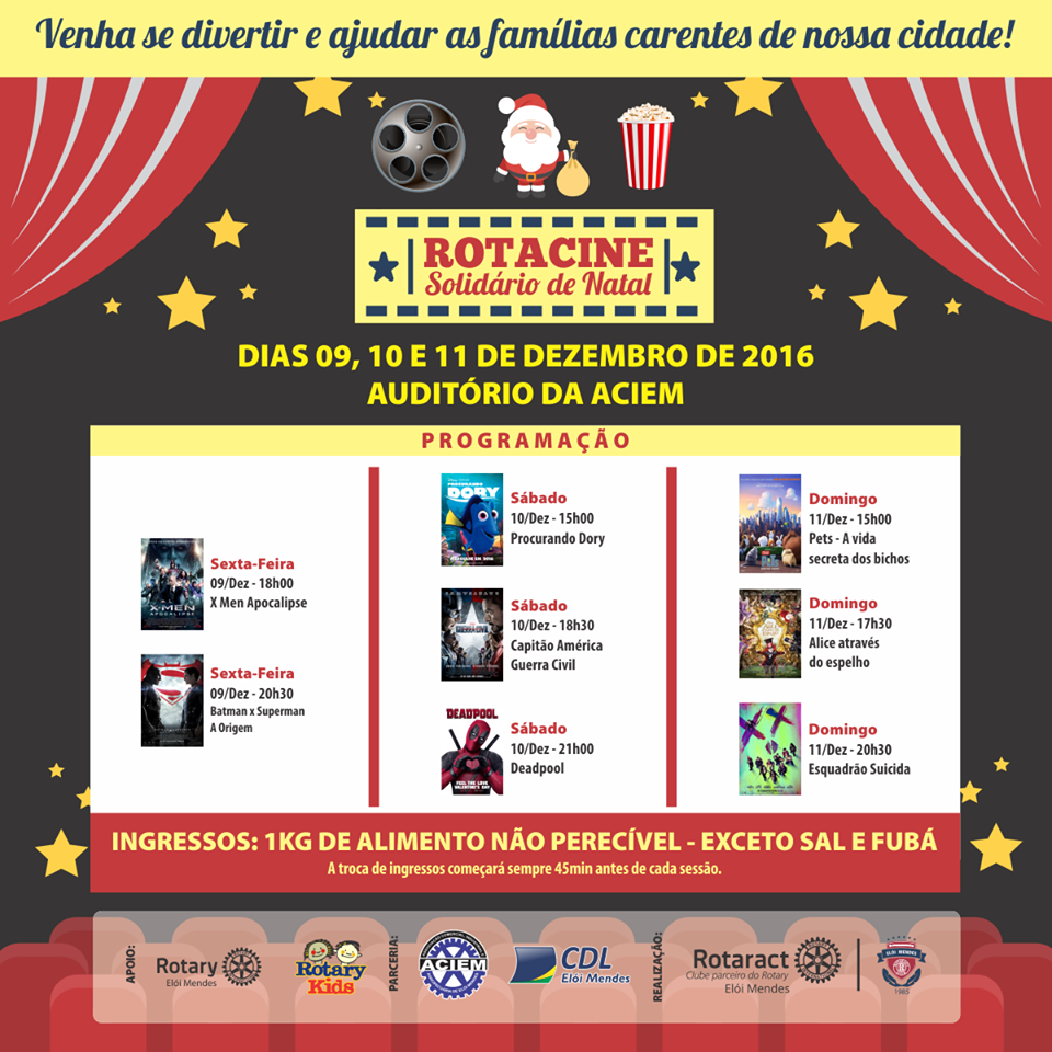 Hoje (09/12) tem cinema na ACIEM. O projeto Rotacine é realizado pelo Rotaract. Clique em Leia Mais e confira a programação.