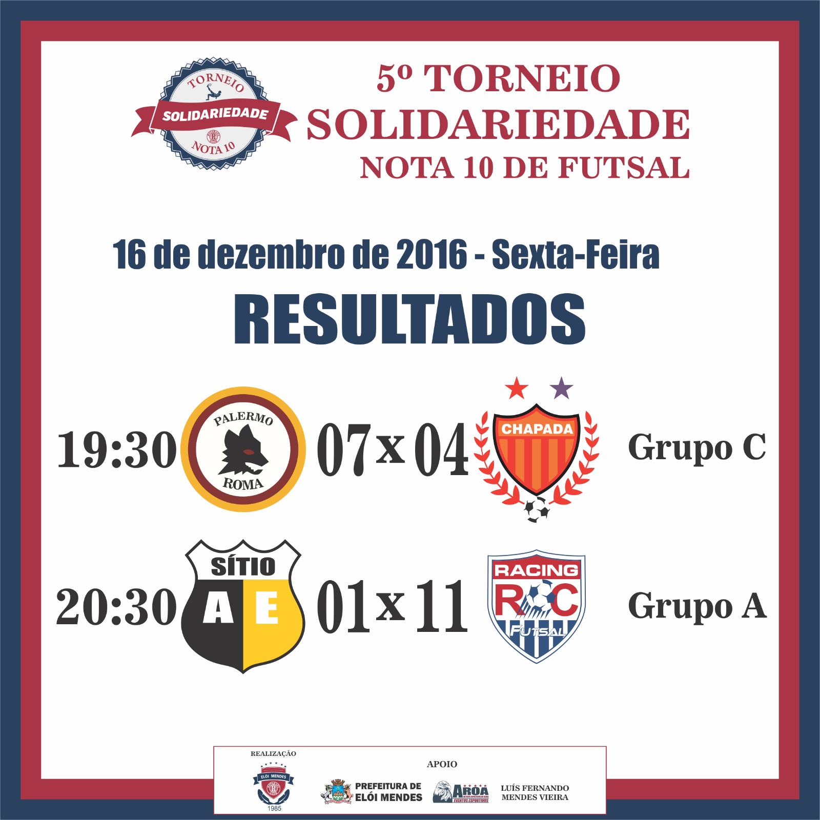 Nesta segunda-feira (19/12), às 20 horas haverá mais dois jogos pela fase das Quartas de Final do Torneio Solidariedade. A partida será no Ginásio Mutucão em Elói Mendes. Clique em Leia Mais e confira notícia completa.
