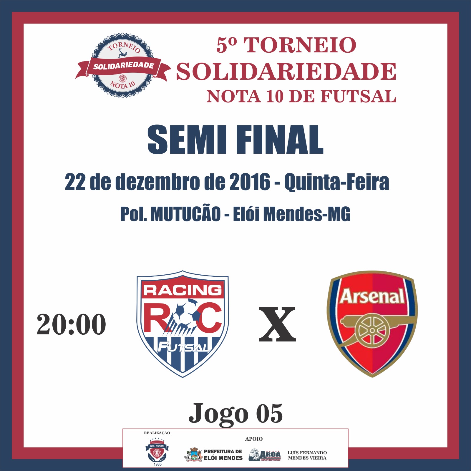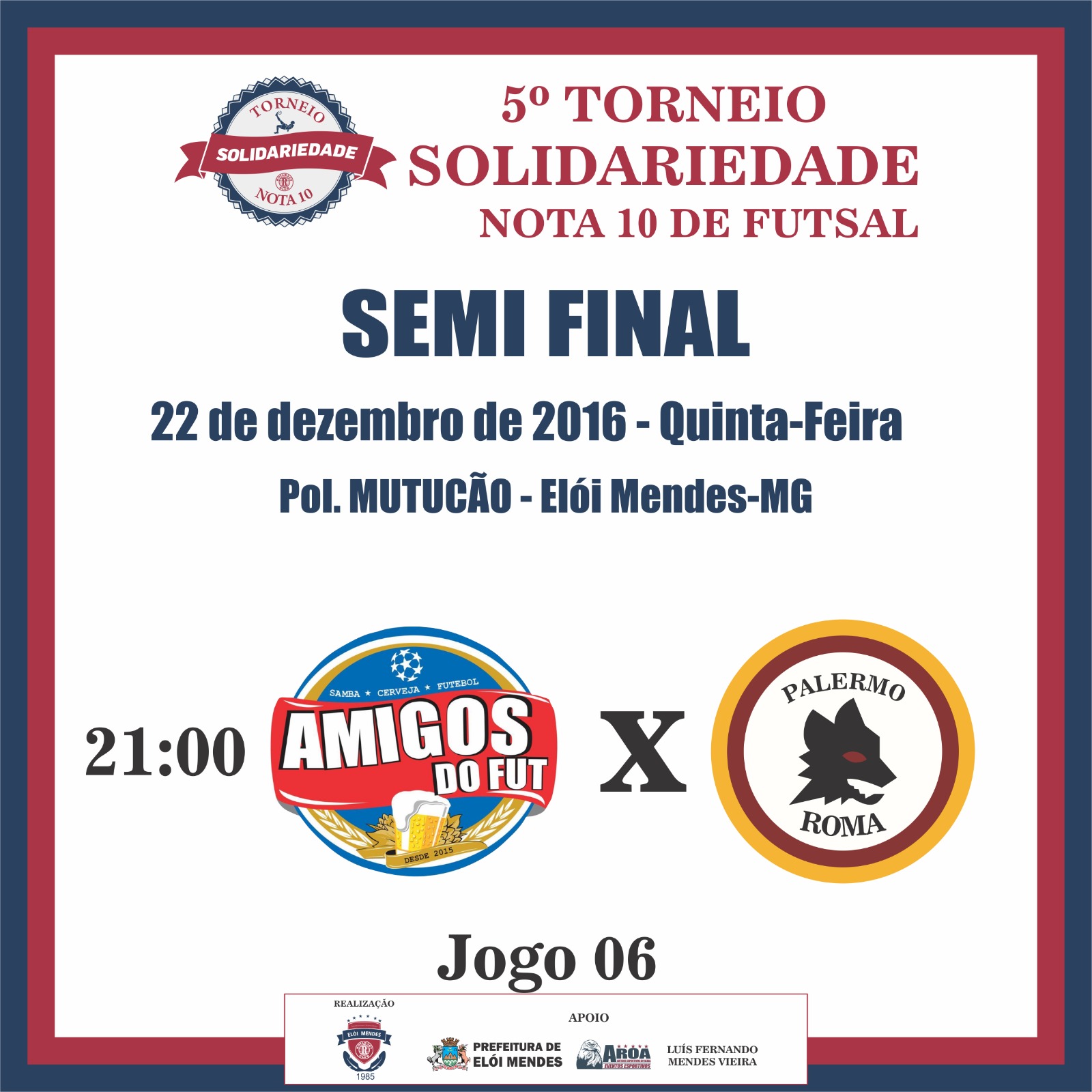 Utilidade Pública Elói Mendes News 22/12/2016 Semifinal do Toneiro Solidariedade no Poliesportivo Mutucão Clique para compartilhar esta notícia Hoje (22/12), ocorre os jogos da Semifinal do Torneio Solidariedade no Poliesportivo Mutucão. Clique em Leia Mais e confira os jogos. . .